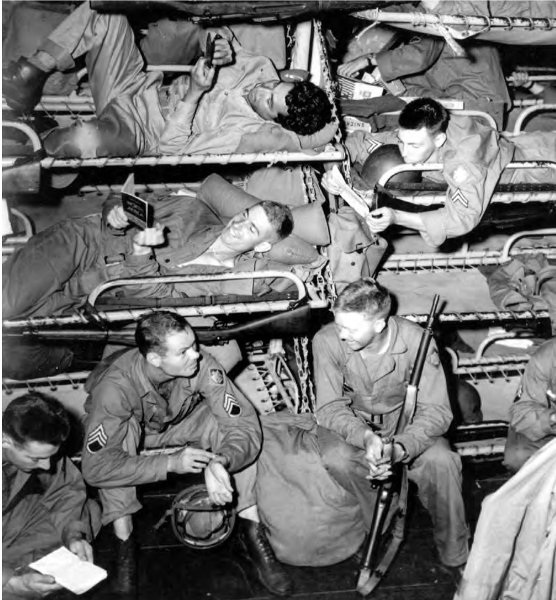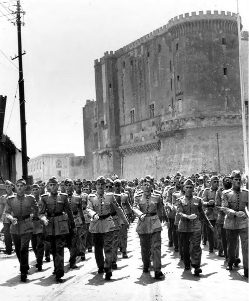 WEARY U. S. TROOPS IN BOLOGNA on the morning of 21 April. The city, entered from the south by U. S. forces and from the east by Poles of the Eighth Army, fell that day. Pressing forward the troops pursued the fleeing Germans.