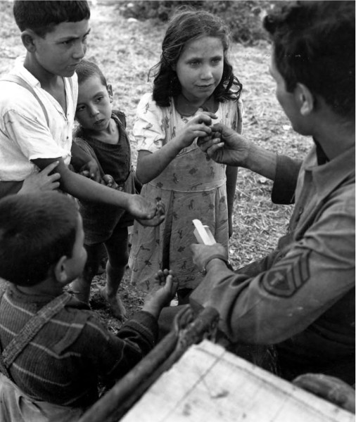 INOCULATING EGYPTIAN WORKER WITH TYPHUS VACCINE. In June of 1942 a separate command was formed in Cairo, called the U. S. Army Forces in the Middle East (USAFIME). Natives working with U. S. personnel were usually under Army medical supervision. Those handling food were subject to physical inspection and received medical treatment and whatever immunization inoculations were indicated for the locality. The use of preventive medicine stopped the outbreak of epidemics.