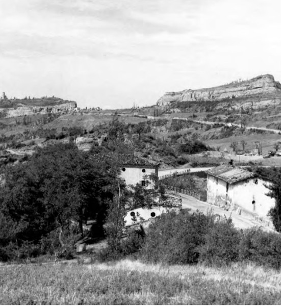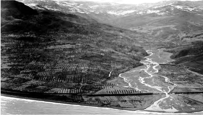 MONTE DELLA SPE AREA, looking toward the east. Highway 64 parallels the Reno River (in distance). The village of Vergato is shown on the west bank of the river. Monte della Spe is the rounded hill in foreground. It was taken on 5 March 1945 during an attack to secure a suitable jumping off place for the spring offensive. Vergato, which was an enemy strong point, and most of the surrounding territory remained in enemy hands after the capture of Monte della Spe. The main offensive, the attack toward the Po Valley, started from here on 14 April 1945 and by the 20th Allied troops had broken into the valley.