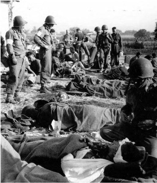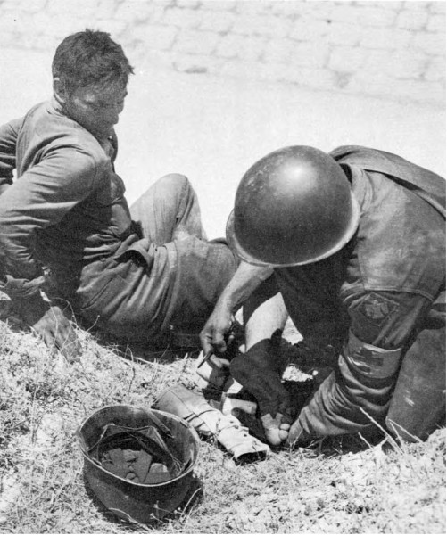 BODIES OF AMERICAN INFANTRYMEN killed during the opening of the spring offensive. Note stretcher bearer in background looking for casualties. The infantry was making an attack across the mountains toward Massa and Carrara on the west coast.