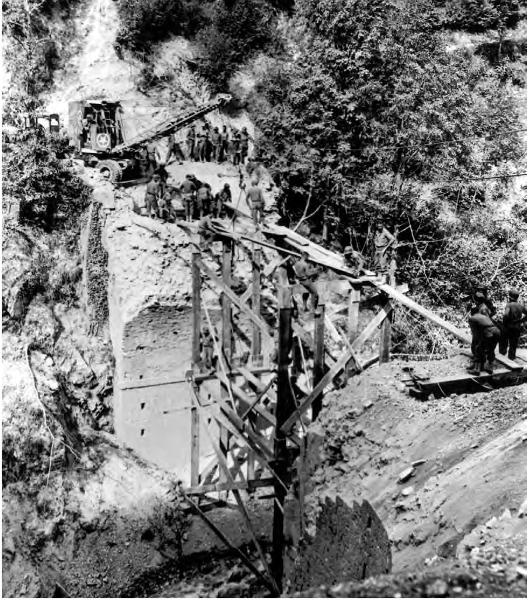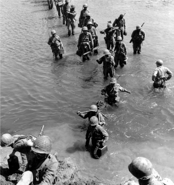 INFANTRY CROSSING PO RIVER UNDER FIRE, Ostiglia railroad bridge, 24 April. The crossing in this zone was opposed by enemy machine guns and 20-mm automatic weapons. The patrol above worked its way to the other side and knocked out enemy guns and crews. The railroad bridge was partially demolished and unfit for vehicles.