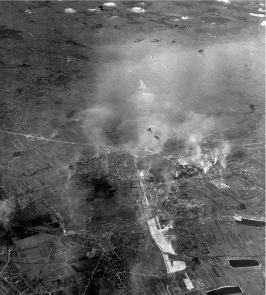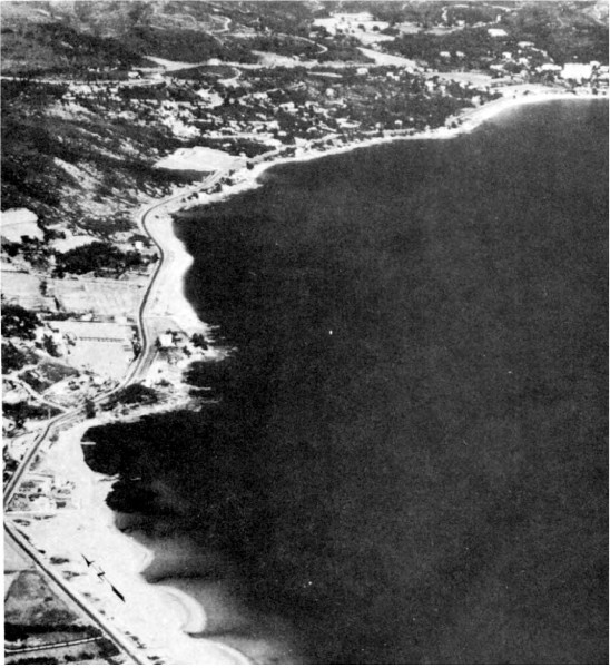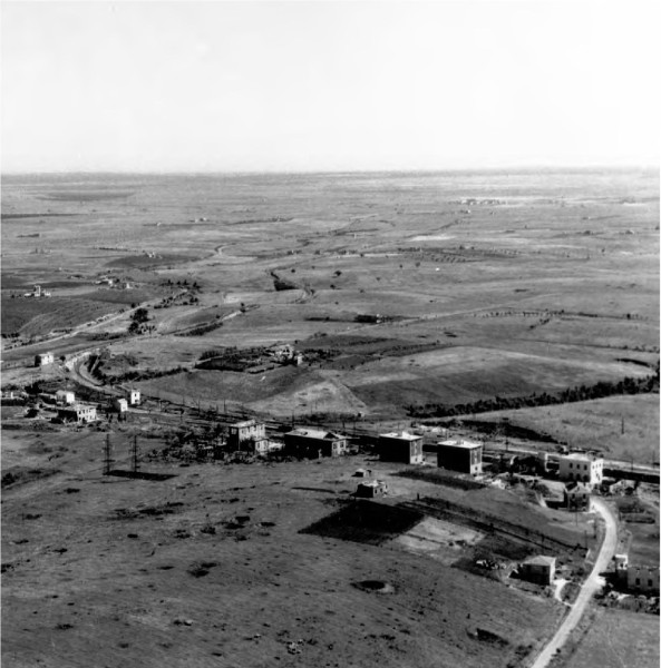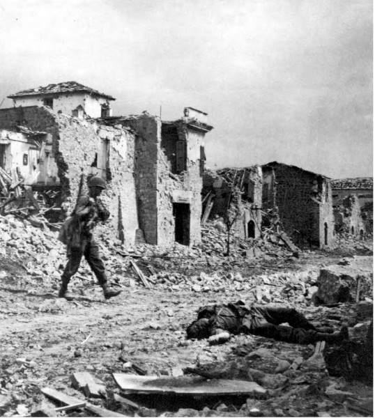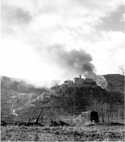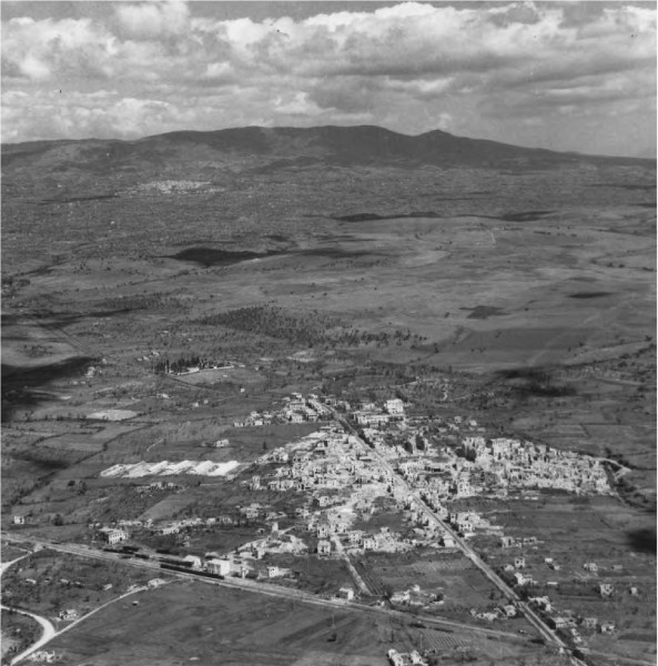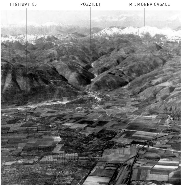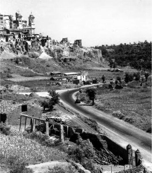 PIANORO ON HIGHWAY 65, looking south toward the hills occupied by the Allies for almost six months. Pianoro, at lower left, was one of the keys of the German defense systems barring entrance to Bologna and the Po Valley. The fight for Pianoro started on 16 April. Entering what was left of the town on the evening of the 18th, the infantry found it booby-trapped.