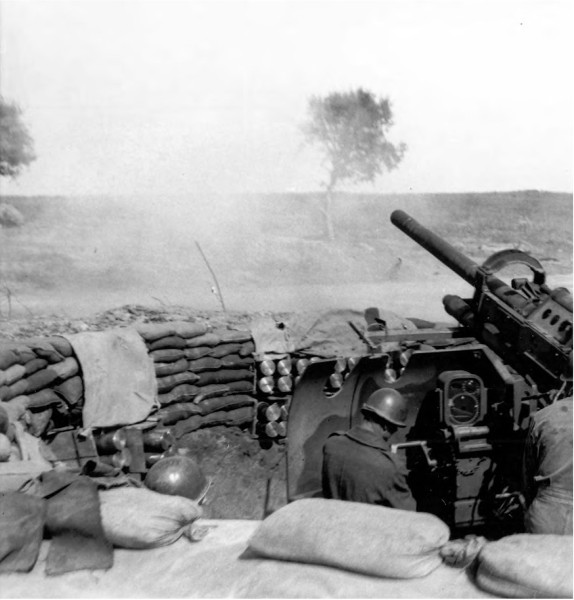 ACTION DURING THE PO RIVER CROSSING at Ostiglia, 24 April. A 57-mm. antitank gun firing in support of an infantry assault across the railroad bridge to the north bank of the river. (The British 6-pounder was the forerunner of the 57-mm. gun. It was adapted for U. S. use and also manufactured for other United Nations under the lend-lease agreement as the 57-mm. antitank gun.)
