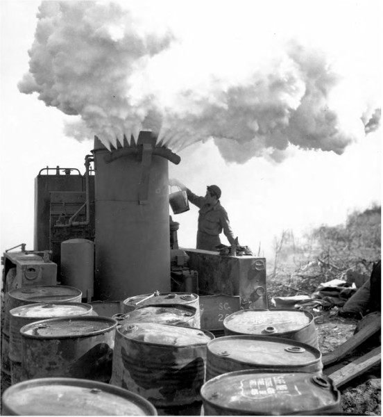 FERRYING EQUIPMENT ACROSS THE PO in support of the infantry assault, Ostiglia, 25 April. The large vehicle is a 76-mm. gun motor carriage M18, designed for tank destroyer use. It was a full track-laying type, using a torsion bar independent suspension, and was front-sprocket driven. The vehicle was lightly armored, had a low silhouette, and was highly mobile.