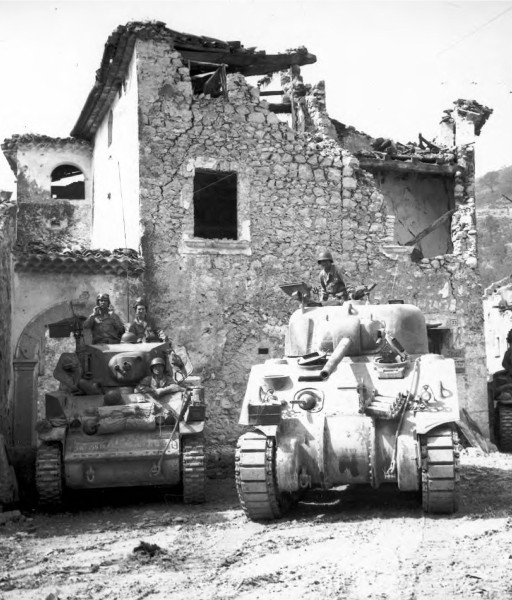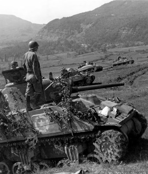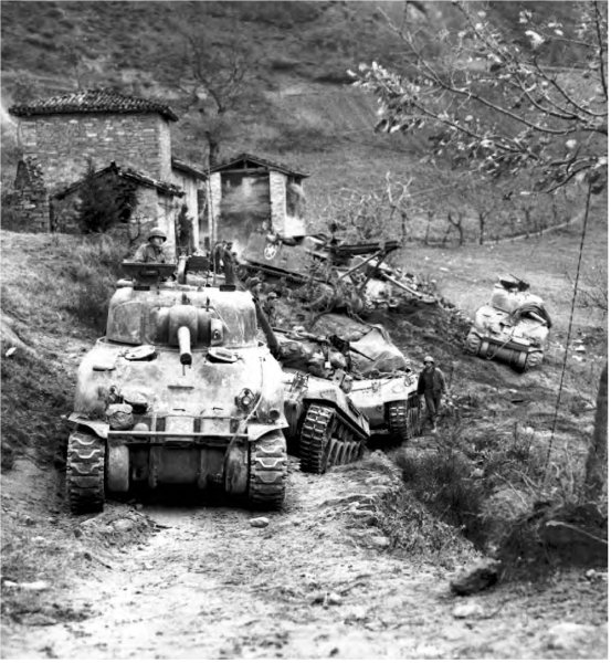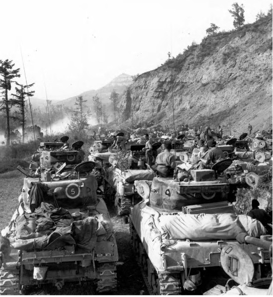 SOUTH AFRICAN ARMOR waiting along Highway 64 for a U. S. infantry division to pass on its way to the Po Valley, 20 April. On this date the troops in the U. S. zone broke through the mountains into the Po Valley just west of Bologna. The two highways in this area, 64 and 65, became congested with troops and vehicles in pursuit of the fleeing enemy. (Sherman medium tanks.)