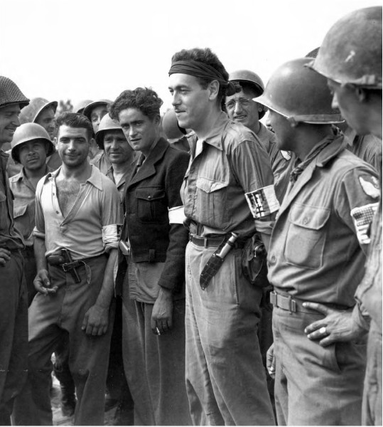 ITALIAN PARTISANS WATCHING FOR SNIPERS. During the winter of 1944–45 Allied officers, arms, and ammunition were dropped behind the enemy lines to assist partisans in the Po Valley. Although partisans, armed with equipment obtained from Italian arsenals or seized from the Germans, first appeared north of Rome, it was not until the Allies reached Bologna that they met the efficiently organized groups from the Po Valley. As troops entered the city, where the Germans were numerous, the partisans struck, seizing government agencies and public utilities.