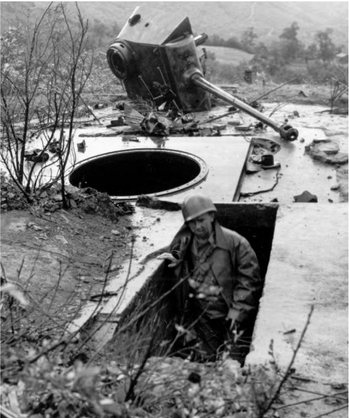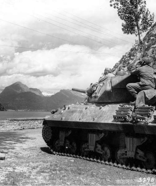 TANK DESTROYER on the shore of Lake Garda blocking one of the escape routes to Brenner Pass. Heavy fighting took place in the demolished tunnels on the road along the east shore of this lake, but on 30 April the area was under Allied control.
