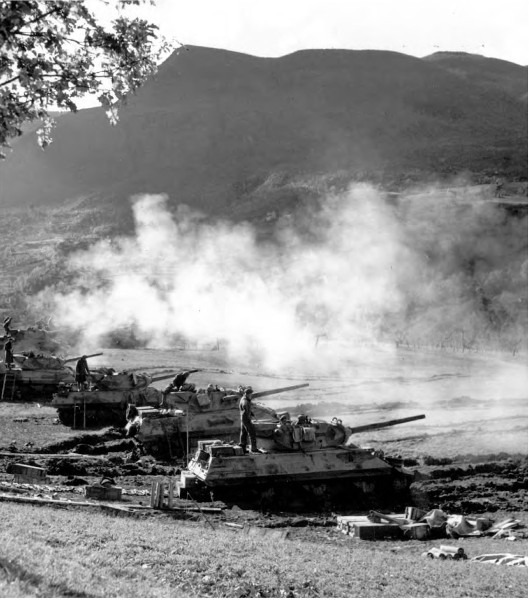 SELF-PROPELLED GUNS of a South African armored unit firing a mission a few days before the attack to break into the Po Valley. These vehicles are American Sherman tanks modified by the British as self-propelled guns. Prior to the jump-off, the units along the Fifth Army front had been engaged in a series of deceptive artillery fires.