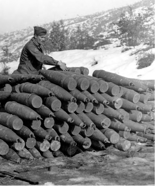NEGRO SOLDIERS FIRING HOWITZERS in support of the Nisei who were making an attack northward along the mountain ridges toward the towns of Massa and Carrara. The attack started on 5 April 1945. The Nisei were American soldiers of Japanese ancestry. (75-mm. howitzers.)