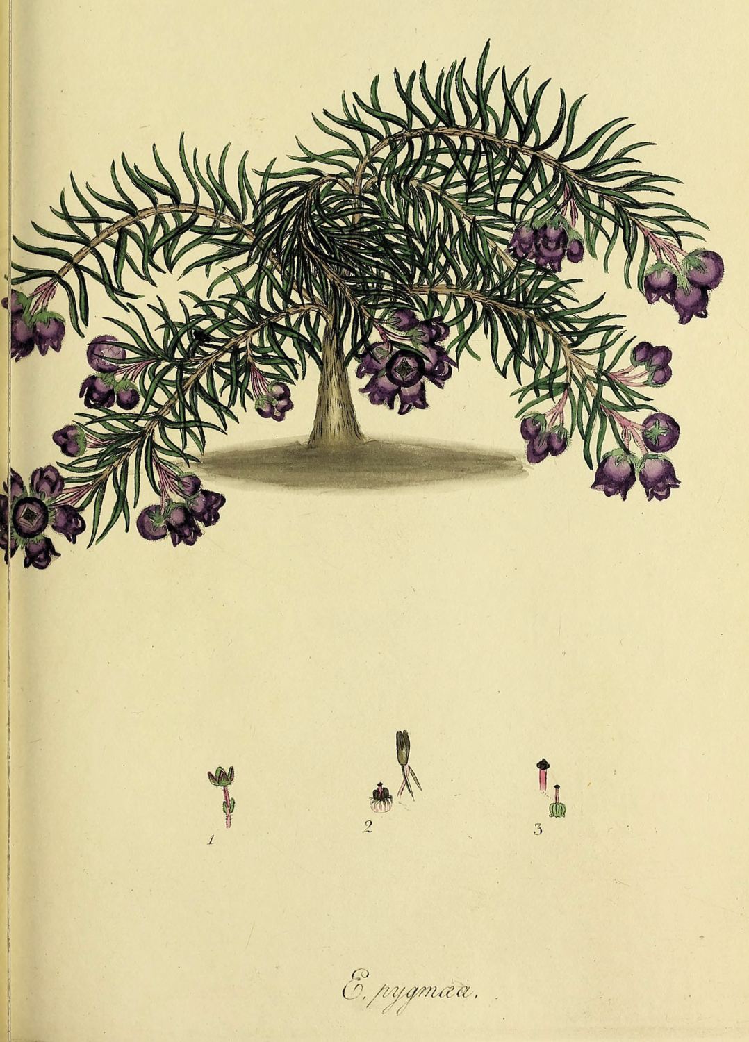Tips crested, within the blossom. Flowers terminate the branches in umbels. Cup four-leaved; leaflets spatula-shaped, sharp-pointed, and flesh-coloured. Blossom pitcher-shaped, of a black red colour, whitish at the base; segments of the border spreading and pointed. Leaves by threes, lance-shaped, three-sided, pointed, and pressed to the branches. Stem twiggy, a foot high. Branches flexuose.