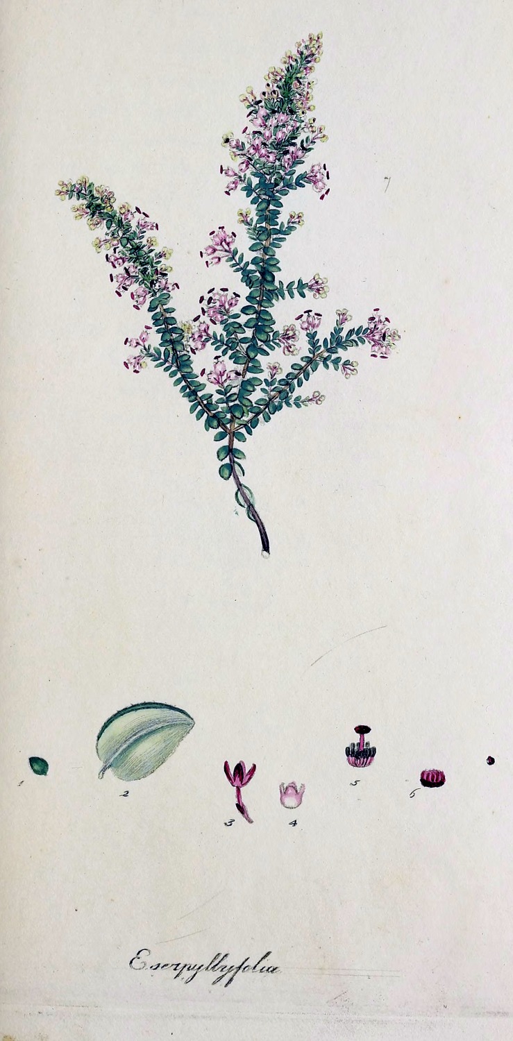 Tips beardless, just within the blossom. Flowers terminate the branches, mostly by threes, ascending, and spreading. Blossom cylindrical, rose-coloured, downy, and pellucid: segments of the border equal, and rolled back. Leaves by threes and fours, linear and short, slightly incurved, three-sided, pointed, and smooth. Stem shrubby, a foot and a half high. Branches numerous, flexuose, twiggy, and thread-shaped.