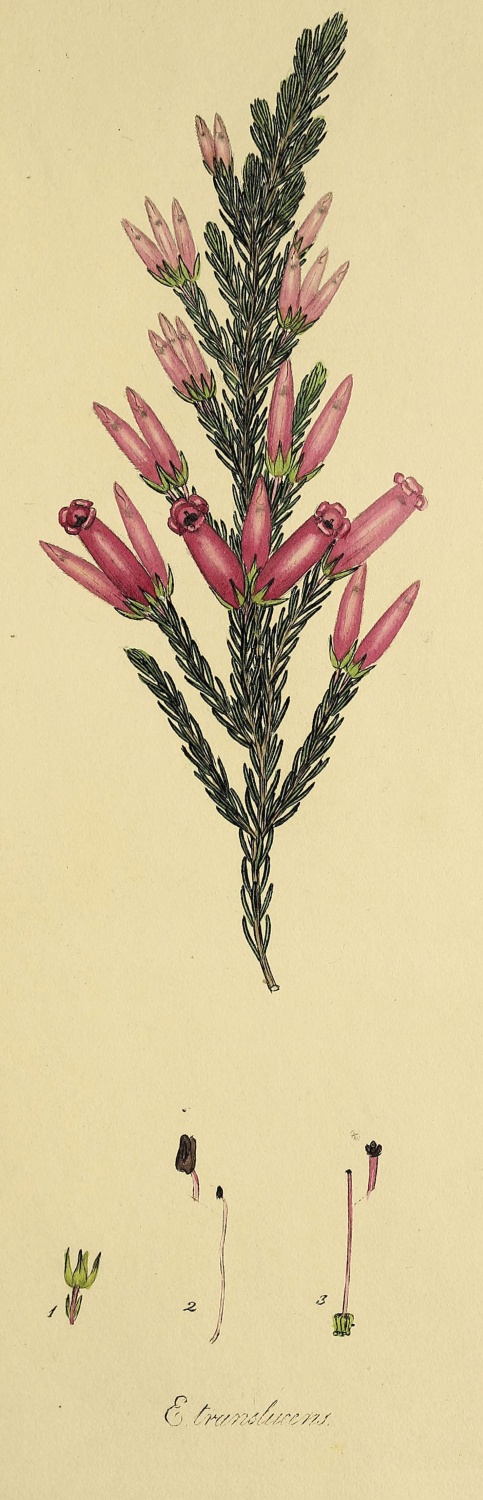 Heath with beardless tips, within the blossom. Flowers terminate the branches in crowded heads. Blossom pitcher-shaped and flesh-coloured. The cup is large and coloured. Footstalks very short. Leaves by threes, awl-shaped, smooth, and pressed to the branches. A dwarf shrub with a stout stem, the large and smaller branches thread shaped and flexuose.