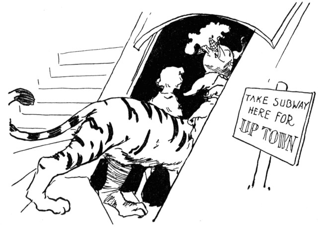"How about a little lunch?" proposed the Hungry Tiger, putting his paws over his ears to drown out the roars and cheers of the populace.