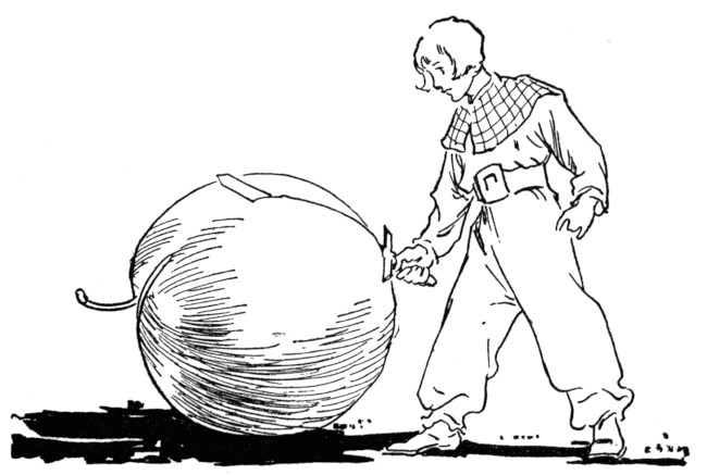 "We don't mind at all," laughed Betsy, while Dorothy and Trot, who had just joined the group, exchanged merry winks. Jack was so amusing that no one could help chuckling when he was around. He had been made by Ozma, when she was a little boy, and was almost as unusual as the Scarecrow. To those not familiar with Oz history, this may seem a bit strange, but Ozma once was a little boy, having been transformed by old Mombi, the witch. And while she was a little boy she had carved Jack neatly from wood and set an old pumpkin on his peg neck for a head. Later he had been brought to life by mistake and has been living merrily ever since. Every month or so Jack has to pick a pumpkin and hollow out a new head for himself, so that he is constantly changing his mind, but Ozma has a deep affection for the queer fellow, and Jack is so odd and jolly that he is a great favorite in the Emerald City.