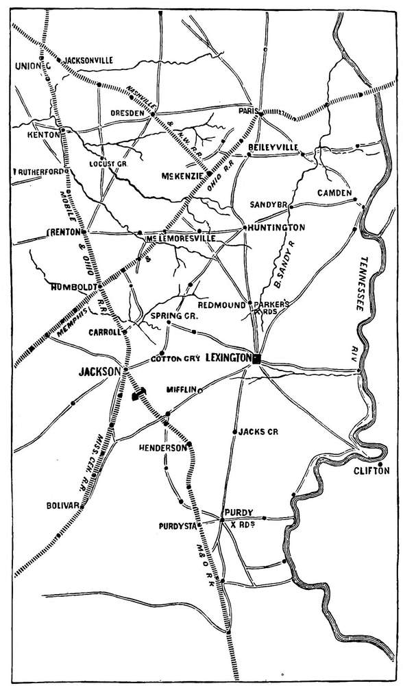 Forrest left Chalmers with four thousand men in front of the enemy. He was ordered to persistently attack and oppose them in every way possible, to delay their march and to assail their flanks and communication. Incessant rains had fallen for some days. The roads were muddy, and the streams were full to the banks. Forrest’s chance in the expedition which he now undertook was dependent upon the secrecy with which it should be consummated. If Smith knew that[Pg 610] he was not in front, he and Grierson and Hurlbut would run over the small force commanded by Chalmers and march to Vicksburg. No sooner had the sun gone down on the 18th of August than Forrest left Oxford with his two thousand men, the best mounted that he could cull and select. The word to mount was anxiously awaited. These chosen men had gone with their leader before. It was raining furiously—had been raining almost constantly for forty-eight hours previously. With their soggy clothes hanging about their drenched limbs, they were impatient to try out another conflict, and see what glory had in stock for them in a new encounter. The darkness of night was approaching when, amid the thunder and downpour, these Forrest followers sprang into their saddles, gave rein to their steeds, and with a long drawn-out rebel yell, set forth, defying weather, to once again contest with their foes. Rain, floods, mud had no terror for them where their general and duty pointed the way they must go. Marching all night west and north, when the day dawned, notwithstanding the conditions which faced him, he had swung clear off the route of the Federal Army, and was miles away before any Federal officer or commander dreamed that Forrest was gone. Traveling all day on the 19th and part of the night, on the morning of the 20th he had reached Senatobia. This was a long ride for Forrest and his followers. One raging stream and insecure bridge were crossed, and by courier he told Chalmers that he would soon cross another, and, like Columbus, passing westward with only one command, westward, westward, he was going northward, northward.