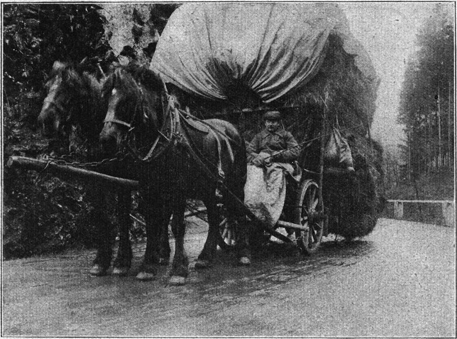 Abb. 6. Wie Tuchballen wird der Holzstoff gerollt. Hochaufgeschichtet lagert er auf dem Wagen, der nach dem Bahnhof Glashütte fährt. Seitdem Friedrich Gottlob Keller die Holzstoffpapierbereitung erfunden hatte, wandelte mancher Kleinmüller des Tales seine Mahlmühle in eine Holzschleiferei um. Schleifmühlen waren diese Betriebe, denn das Mühlrad bedeutete für sie das Lebensrad. Als aber auf der »eisernen Straße« die Kohle ins Tal gebracht wurde, da bekam das Wasser im Dampf einen gewaltigen Gehilfen, der ihm im trocknen Sommer und kalten Winter die Arbeit abnahm, lange Hauptantriebskraft blieb, bis in unsren Tagen die »über Land gejagte Kraft« den Dampf abzulösen beginnt. Die Eisenbahn ist auch der Grund dafür, daß der Wanderer ganz selten einem Holzstoffuhrwerk auf der siebenstündigen Talwanderung von Mügeln (Heidenau) bis Geising begegnet, da Gleisanschluß den Eisenbahnwagen bis in den Hofraum der Fabrik fahren läßt und hier die Erzeugnisse sogleich hineingeladen werden. Nur auf dem kurzen Wegstück von Glashütte bis Bärenhecke wird es möglich sein, ein Fuhrwerk mit den gelblichen, feuchten Holzstoffballen zu sehen. Die Fahrt zum Bahnhof geschieht aber nicht an jedem Tage.