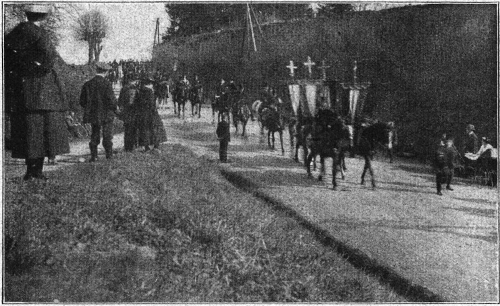 Nachdem auch diese Reiter den Klosterhof wieder verlassen haben, verläuft sich die Menge. Autohupen, Fahrradklingeln, Peitschen, menschliche Stimmen lassen sich im freien Wettbewerb der Kräfte hören. Froh ist, wer endlich dem Gewühle entronnen ist und die freie Straße erreicht hat. Von links schallen die Klänge der »Stanył je horje Jězus Khryst, alleluja!« herüber. Auf einem Feldwege tauchen erst bunte Kirchenfahnen, dann Reiter und endlich der ganze Zug auf, der als erster Marienstern verlassen hat.