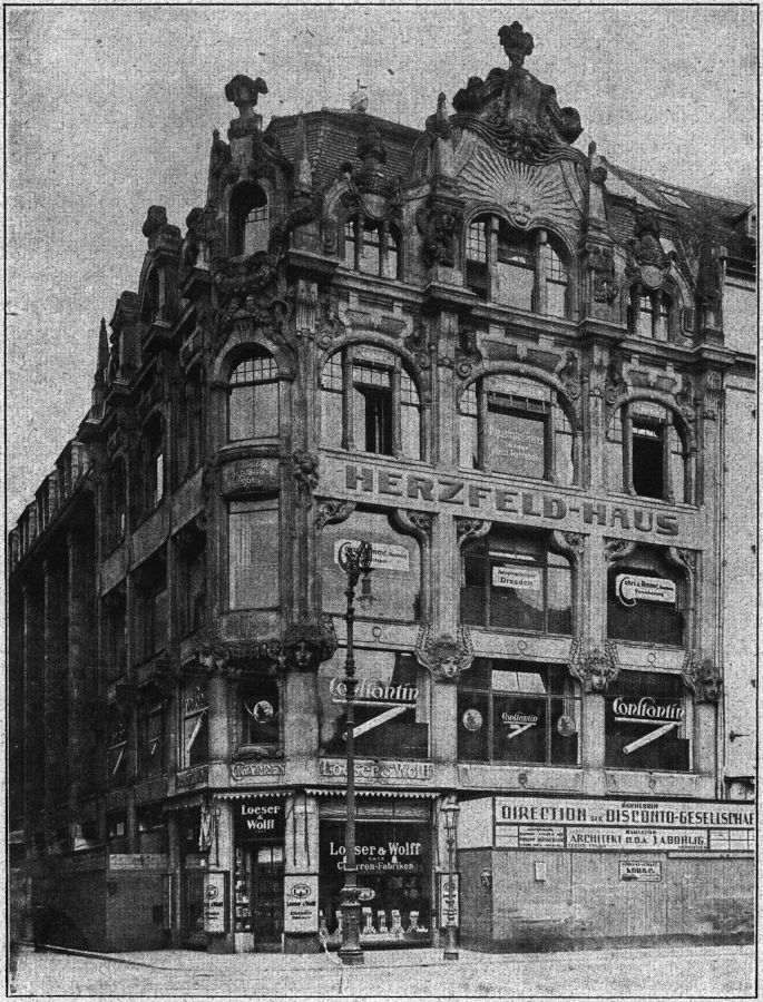Eines Tages besuchte mich Prof. William Lossow, der Mitbesitzer der Architektenfirma Lossow und Viehweger, und zeigte mir den Entwurf zu einem Geschäftshaus für die Firma Herzfeld, das am Altmarkt zu errichten sei. Bedingung sei, daß die Fassade als Reklame für die Firma wirke, und daß das alle Geschosse in Anspruch nehmende Warenhaus möglichst ein großes Schaufenster darstelle, also möglichst viel Glasfläche biete. Lossow hatte den damals üblichen Barockstil gewählt, d. h. den Stil, der sich im Überbieten des heimischen Barock gefiel. Er erklärte, daß er versucht habe, die Firma Herzfeld zu einem Herabstimmen ihrer Anforderungen an Aufwand und Auffälligkeit zu bewegen, daß das aber vergeblich gewesen sei.