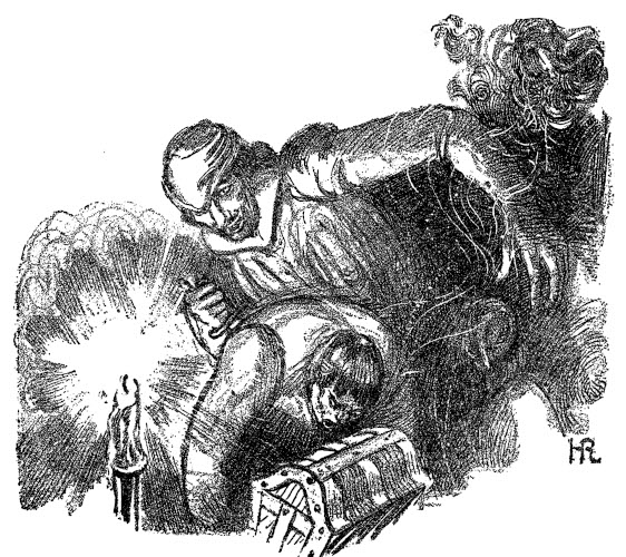 "Ah-h-h!" from somewhere came the explosive sigh, from that shadowy semicircle where crouched the terror-fascinated worshippers. Straight on stalked the grim specter. Now it was within three strides of the thrones, and Le Loup, faced by fear for the first time in his bloody life, cringed back in his chair; while Songa, with a superhuman effort breaking the chains of horror that held him helpless, shattered the night with a wild scream and, springing to his feet, lifted a spear, shrieking and gibbering in wild menace. Then as the ghastly thing halted not its frightful advance, he hurled the spear with all the power of his great, black muscles, and the spear tore through the dead man's breast with a rending of flesh and bone. Not an instant halted the thing—for the dead die not—and Songa the king stood frozen, arms outstretched as if to fend off the terror.