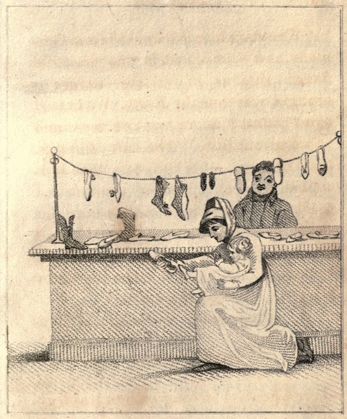 "They are called Lambs'-wool stockings, my dear, and are particularly serviceable to the aged and infirm. The old gentleman looks as if he was reckoning up his money, that he may know whether his purse will allow of his indulging himself with more than one pair of his favourite Lambs'-wool stockings. Let us look at some white silk.—Silk you know is imported from Italy, it is produced by a worm which feeds on the leaves of the mulberry-tree. Cotton is imported from Asia, of which we make our fine cotton stockings. The wool of sheep supplies us with worsted stockings, the chief wear of the working classes of men, and the skins of animals give us that necessary finish to our dress, gloves. The best and handsomest of this latter article are made in France, but are prohibited from being sold in England, that they may not injure our own manufactures."
