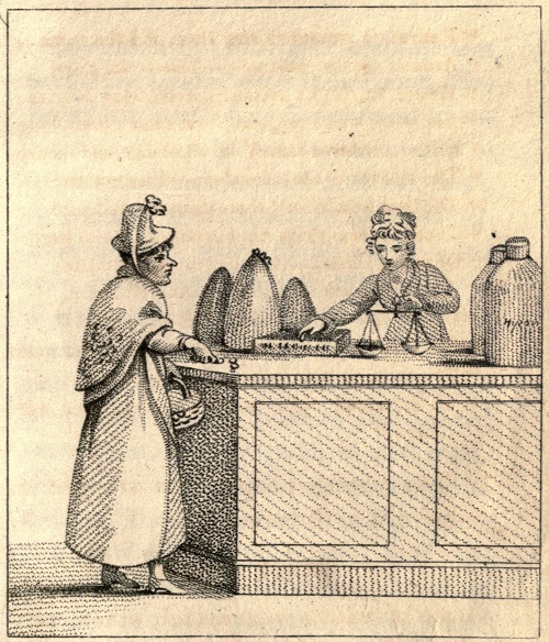 and a short vulgar looking female, who with a sharp turned up nose, pointed chin, and staring eyes, was watching the woman as she weighed the tea, lest she should fail to give her the turn of the scale.