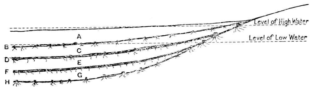 The next deposit (C), lying beneath the submerged forest, is commonly another bed of estuarine silt, extending to a depth of several feet and carrying our observations well below the level of low-water. Then comes a second land-surface (D), perhaps with trees differing from those of the one above; or it may be a thick layer of marsh peat. More silt (E) follows; another submerged forest (F); then more estuarine deposits (G); and finally at the base of the channel, fully 50 feet below the level of high-water, we may find stools of oak (H) still rooted in the undisturbed rock below.