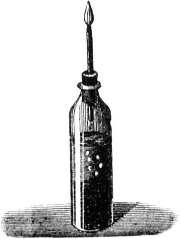 [24] Der gewöhnliche Salpeter – bekanntlich ein Bestandteil des Schießpulvers – kann zu diesem Zwecke verwendet werden. Auch das chlorsaure Kali eignet sich gut dazu. Es enthält viel Sauerstoff und gibt denselben, wie aus dem S. 124 Gesagten hervorgeht, beim Erhitzen leicht ab.