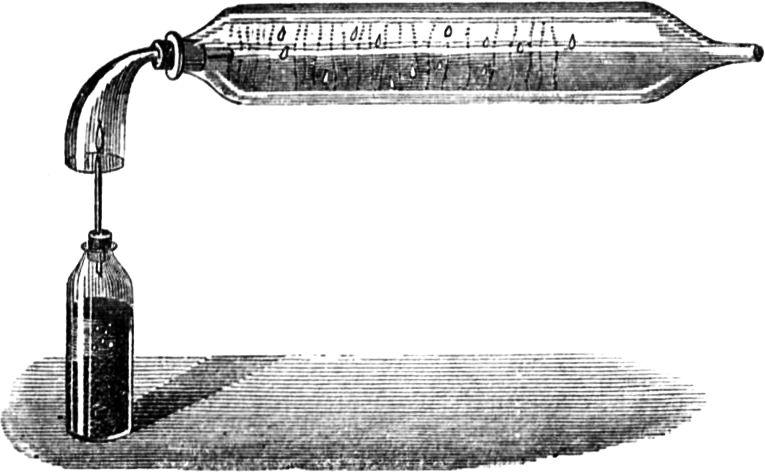 Wir gelangen nunmehr zu einem anderen und zwar sehr wichtigen Teil unseres Thema. Erinnern wir uns, was wir bereits an unserer brennenden Kerze erforscht haben. Wir sahen, daß sie beim Brennen verschiedene Stoffe entstehen läßt, und fanden Kohle in Gestalt von Ruß[19], Wasser und etwas anderes, was wir noch nicht untersucht haben. Das Wasser fingen wir auf, die übrigen Verbrennungsprodukte ließen wir bisher ungehindert in die Luft entweichen. Diese nun müssen wir jetzt unserer Forschung unterwerfen.