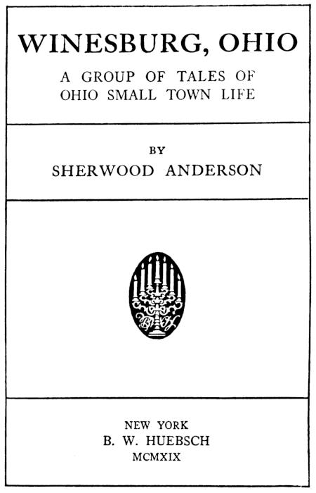 9. WINESBURG, OHIO | A GROUP OF TALES OF | OHIO SMALL TOWN LIFE | [panel line] | BY | SHERWOOD ANDERSON | [publishers’ device with panel line above and below] | NEW YORK | B. W. Huebsch | MCMXIX [title surrounded by single line border]