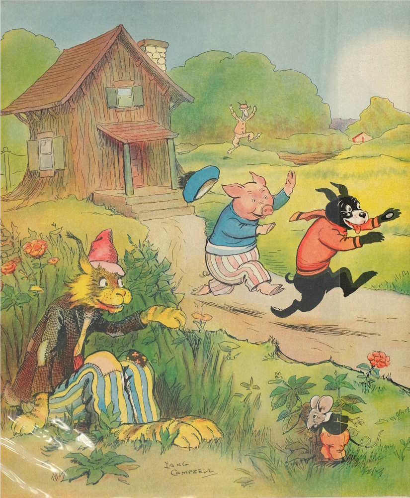 Uncle Wiggily ran after the Fuzzy Fox. “I’ll get you!” shouted the bunny. The Fox ran fast but the rabbit hopped faster and took away the lunch basket from the bad chap. “I would nibble your ears, only I’m out of breath!” panted the Fox. “Ha! Ha!” laughed Uncle Wiggily. He hopped back to Nurse Jane with the lunch. “Where can we set a table?” asked Miss Fuzzy Wuzzy. Along crawled a big mud turtle. “We’ll set our table on the turtle’s back,” said Uncle Wiggily. So they did. But, all of a sudden, as she sat down on a toad stool to eat, Nurse Jane spilled some pepper on the turtle’s tail. Away crawled the turtle as fast as he could go, spilling the picnic lunch. “Oh, dear! How can we get anything to eat?” sighed Nurse Jane. “We shall go visit Mr. Twistytail, a pig gentleman I know,” answered the bunny. Mr. Twistytail invited Nurse Jane and Uncle Wiggily to dinner. They had apple pudding with sour milk sauce.