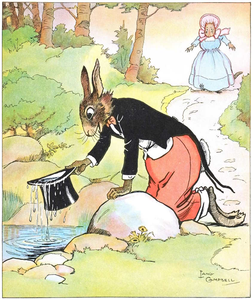 Next day Uncle Wiggily arose early. “Ah, ha, Nurse Jane!” he greeted the muskrat lady. “Do you want to go to the woods and have another adventure with bears?” Miss Fuzzy Wuzzy said she would rather have different fun. “Then I’ll tell you what we can do,” spoke Uncle Wiggily. “We’ll take our own lunch and go visiting in the forest.” Nurse Jane asked whom they would visit. “Oh, perhaps the Squiggle Bugs,” answered the bunny. So he and the muskrat lady went to the woods. “What are you going to do with the rope, Uncle Wiggily?” asked Nurse Jane. “I am going to make you a swing,” politely replied the rabbit. He climbed a tree, fastened the rope to a branch and made a swing for his housekeeper. “Up you go!” cried the bunny, giving Nurse Jane a push. Up and down she swung, and then she called: “I wish I had a drink!” Uncle Wiggily hopped to the spring and filled his tall, silk hat to the brim with water.