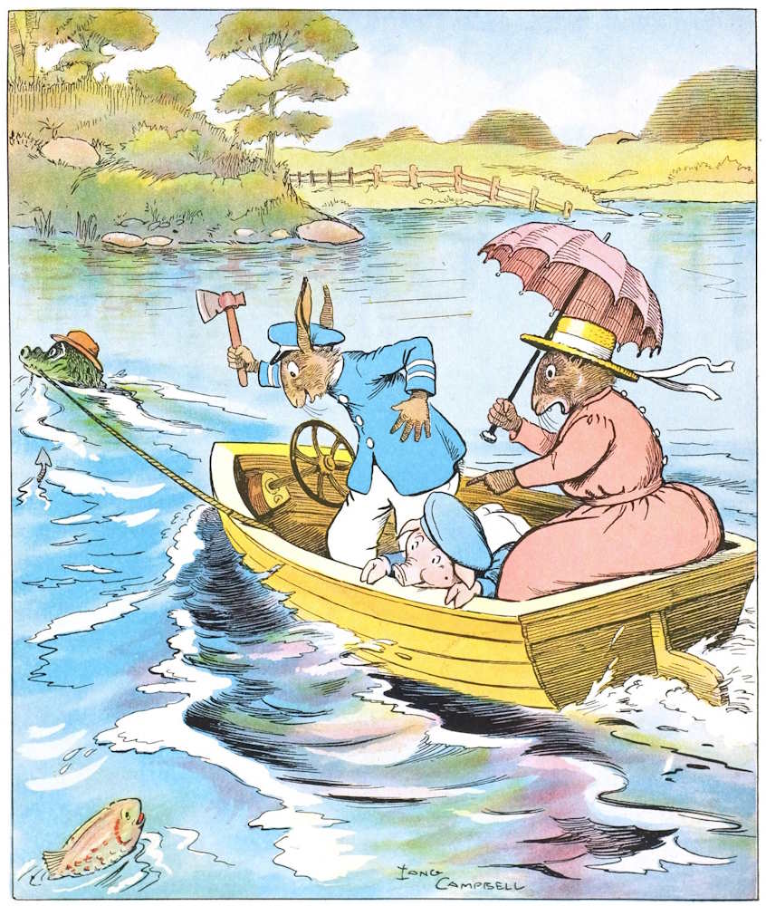 “Let us stop there,” said Nurse Jane, as Uncle Wiggily steered the boat toward the second island. “Are we going to eat soon?” the piggie boy asked. “I’m ashamed of you—wanting to eat all the while, Floppy!” spoke Nurse Jane. Floppy blushed red behind his ears and grunted: “Well, I’m hungry!” By this time the ’Gator and Hippo, eating lunch on the island, had seen the motor boat coming. “You had better let me catch Uncle Wiggily,” bellowed the ’Gator. “All right!” grunted the Hippo. The Alligator swam off under water and caught in his teeth the anchor rope on Uncle Wiggily’s boat. “This time they shall not get away!” rumbled the Hippo. “I’ll hold my mouth wide open and the ’Gator will pull the boat and Uncle Wiggily right in where I can nibble his ears.” On swam the ’Gator pulling the boat toward the big mouth of the Heavy Hippo which opened wider and wider. Nurse Jane gave Uncle Wiggily a hatchet, crying: “Cut the rope!”