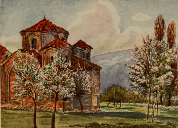 Der Fluß wurde kleiner, die Landschaft immer sommerlicher, höhere Bergketten traten im Süden auf, zum Teil noch mit Schnee[3] bedeckt. Schließlich verließ die Bahn das Moravatal, überschritt die Wasserscheide und trat in der Nähe von Kumanovo in das mazedonische Gebiet ein, was sich in dem ganzen Charakter der Landschaft kundgab. Die Berge waren zurückgetreten, eine weite Ebene breitete sich aus. Wald fehlte hier, während die Felder schon einen vorgeschrittenen Zustand aufwiesen, Gerste und Roggen standen mit fertigen Ähren, einzelne blühende Mohnfelder verrieten den südlicheren Charakter des Landes.