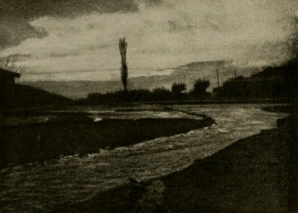 Einige hundert Meter ist diese Flußwildnis lang; hinter ihr treten die Berge nicht stark zurück und zeigen immer noch schöne wildzerissene Steilwände. Täler münden von beiden Seiten ein, die zum Teil in schön bewaldete Mittelgebirge führen. Hier durfte ich als Naturforscher interessante Beobachtungen erwarten. Aber[6] schnell führte mich der Zug jetzt an diesen Tälern vorbei, an Dörfern, die im Schatten von Obstbäumen und Pappeln friedlich lagen, an mächtigen Schotterbänken entlang, welche die Bäche aus den Seitentälern zum Wardar geschwemmt hatten und die von der Wucht der in diesem Gebiet herrschenden Naturkräfte zeugten.