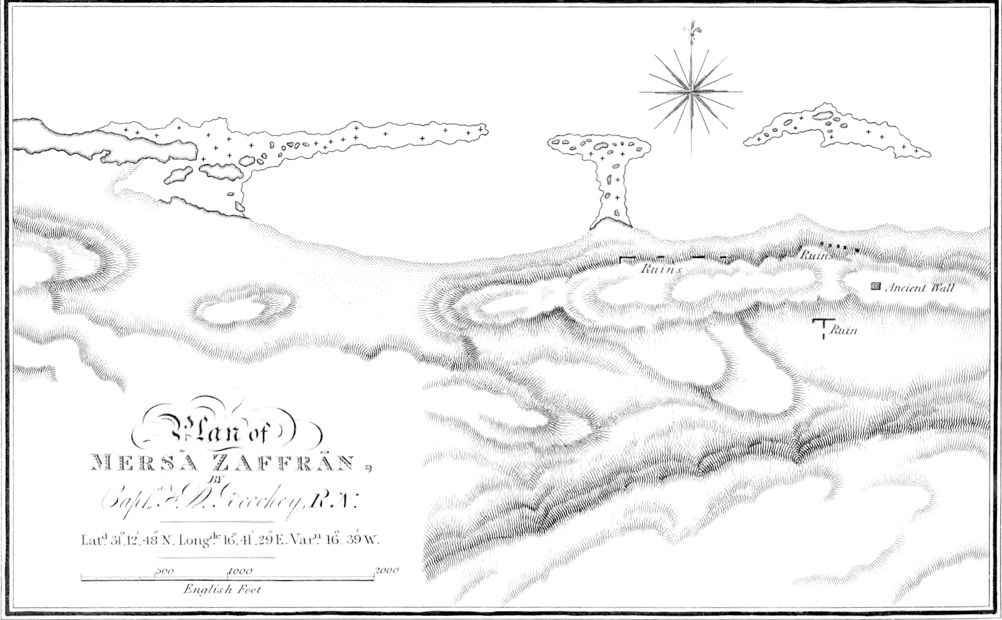 | Entrance of the Syrtis — Extensive Lake, or Marsh, described by Strabo — Remarks of Strabo compared with the actual appearance and extent of the Marsh — Remains considered as those of the ancient Naval Station, described by Strabo, at the Mouth of the Lake — Appearance of another Station more to the northward — Gulf of Zuca — Remarks of Signor Della Cella connected with it — Resemblance of the names Zuchis and Zuca — Non-existence of the Gulf of Zuca in the Greater Syrtis — Error of D’Anville and modern Geographers on this point — Remarks of Signor Della Cella on the terms Marsh and Lake, as applied to the body of water mentioned by Strabo — Dimensions of the existing Marsh — Alleged danger of crossing it — Insulated spots in several parts of the Marsh, corresponding with the accounts of Strabo — Arrival at Sooleb — Appearance of Pasturage in this Neighbourhood — Liberality of Shekh Mahommed — Cause of it ascertained — Sooleb occupies the place assigned in modern Charts to the Gulf of Zuca — Continuance of the Marsh — Remains near Mahada called Kusser el Jébbah — Story connected with them related by the Dúbbah — Unwillingness of our Arab Guides to cross the Marsh — Cause of this ascertained — Narrow escape of two of our party — Nature of the Soil in this Neighbourhood — French Inscription left by the Boats of the Chevrette — Another left by the Barge of the Adventure — Arrive at Mahàd Hassàn, probably the Turriss Hassàn of Edrisi — Remains at Mahàd Hassàn — Arrive at Giraff, where the Marsh terminates altogether — Refractory conduct of our Camel-drivers — Improvement[x] in the appearance of the country — Arrival at Zaffrān — Grateful verdure of its Pasturage — Remains at Zaffrān considered as those of Aspis — Their nature and appearance described — Port called Mersa Zaffrān considered as that of Aspis — Difficulties attending this position — Remains on the Beach — Supposed Date of the Buildings at Zaffrān — Remarks connected with them — Castles mentioned by Leo Africanus — Construction of the Forts at Zaffrān | 113 |