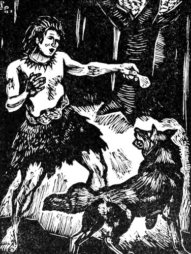 Then came an instant's precious respite. Wuff, who had been skulking among the shadows to the rear, sprang with a snarl toward Grumgra. Grumgra, wheeling about, swung his club not at his human foe but at the beast. He missed by less than an inch. Frightened by the crash of the descending cudgel, Wuff went scurrying out of reach as if at the sound of an explosion; while Grumgra turned once more to the chastisement of Ru.