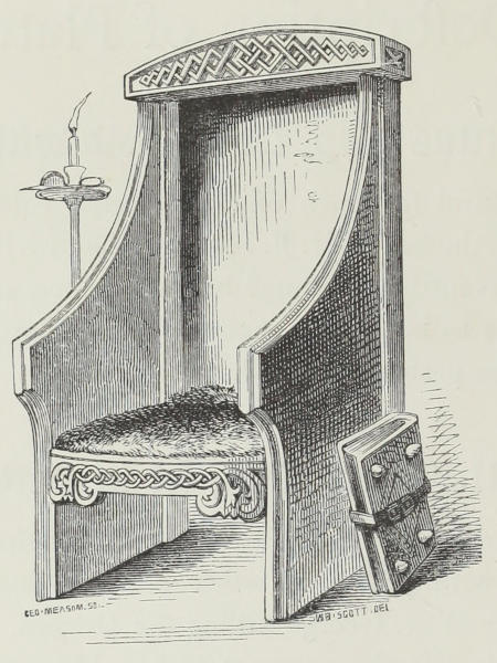 Of the chair of the Venerable Bede, little can be said. It has often been engraved: is four feet ten inches high: made of oak. Its ornamentation has never been great, probably not more than the following restoration exhibits.