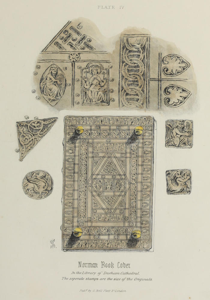 This is from a MS. of the book of the Prophet Isaiah, with a gloss or commentary, presented to the Prior and convent of Durham, along with others by Robert de Adington, who is known to have lived about 1160, and preserved in the Library of the Cathedral of Durham, to the present time. It is a leather cover without knobs, those having been added in the etching as characteristic of the binding of that time. It will be seen that the general design is completed by repeating the individual stamps of which it is composed.