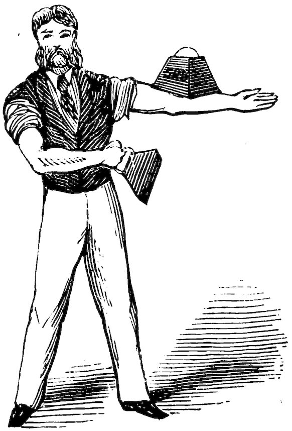 Nevertheless, Mr. Panky, with his usual assurance, announces that—without his approaching—he has the power to attract the coin to him, and, in truth, he suddenly holds it up in plain sight. The person takes away the handkerchief, and is even more astounded than the most impressionable amongst the spectators, to see nothing but the water in the glass—of which the magician relieves him by swallowing it.