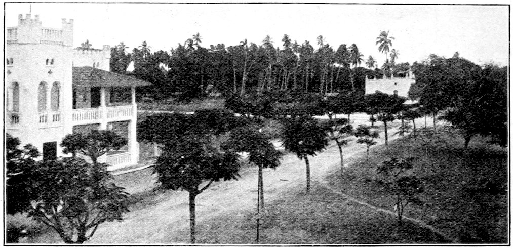 Where there are Germans, there is also music. Dar es Salam enjoys the advantage of two bands—that of the sailors from the two cruisers, and that of the askari. Both are under official patronage, but I cannot say much for the proficiency of the native performers: in any case, their music was accompanied by a great deal of noise. At Tanga it is not in economic matters only that the residents assert their independence—even the Boys’ Band of that town is a purely private enterprise. Tanga is a scholastic centre par excellence, hundreds of native children being instructed in the elements of European knowledge and initiated into the mysteries of the German tongue, which, indeed, one finds that all the little black imps can speak after a fashion. The more intelligent, in whom their teachers discover, or think they discover, any musical gift, are admitted to the famous Boys’ Band. This is just now in excellent training. When the passengers from the Admiral presented themselves in the evening on the square in front of the Club, the band turned out to welcome them, and the playing was really remarkably good.