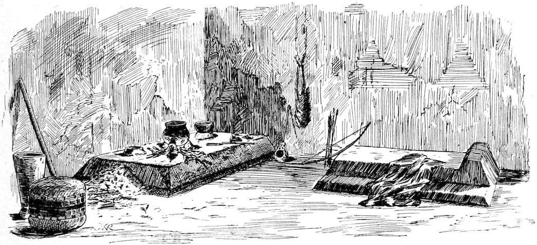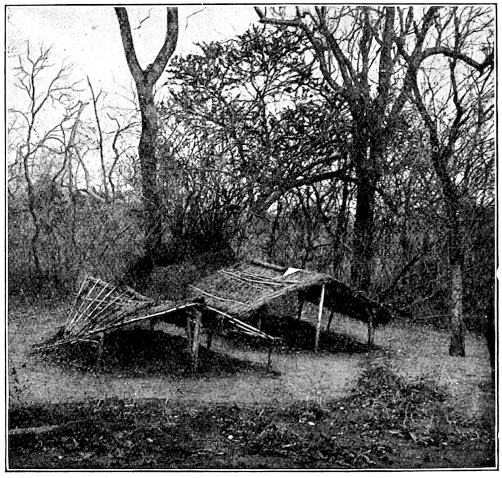 35. The old custom of the Yaos (at any rate in the case of a chief) is to bury the dead man inside his hut (or where he has several, in that of his principal wife), which is then closed, and allowed to decay. Lengths of calico (the quantity being proportioned to the wealth of the deceased) are draped over the roof and left there. Perhaps the building of a house over the grave, which appears to be done sometimes near Lake Nyasa, is a later modification of this custom.—[Tr.]