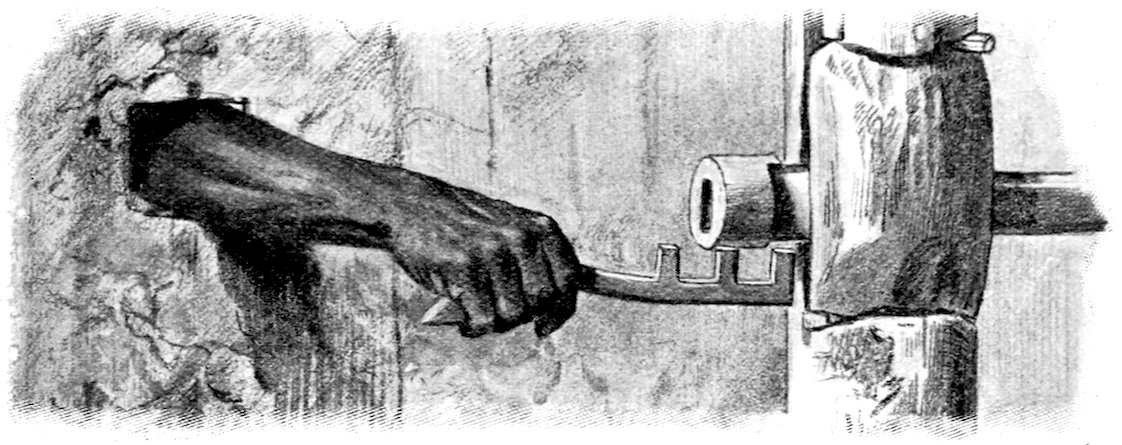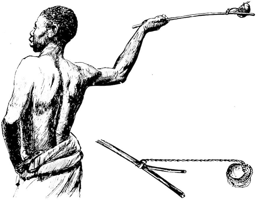 50. “This kind of lock and key,” says the late Rev. D. C. Scott (Cyclopædic Dictionary of the Mang’anja Language, s.v., mfungulo), “is common among the Ambo branch of the Mang’anja” (living between the Ruo junction and the sea), “and is a wooden key about a foot long, with three teeth; it is passed in between the wall-post and upright door-stick (kapambi) inside, and the teeth fit into notches and lift the bolts; only the Ambo can make them and they lock their door thus behind them, carrying the key with them when they go to any short distance from their house.” (See also svv. Funga and Mtengo: “mitengo ya Ambo, the Ambos’ stick keys.”) The ordinary method of fastening the door (chitseko) is by cross-bars, slipped in between the door and the side posts. The following passage from Mr. Charles Doughty’s Travels in Arabia Deserta seems to show that this Ambo form of lock and key must have been borrowed, directly or indirectly, from the Arab settlers on the coast—doubtless at a remote period, as it seems to be no longer in use among the latter. “The fastening, as in all Arabic places, is a wooden lock; the bolt is detained by little pegs falling from above into apposite holes, the key is a wooden stele, some have them of metal, with teeth to match the holes of the lock, the key put in under, you strike up the pegs and the slot may be withdrawn” (Vol. I, p. 143).—[Tr.]