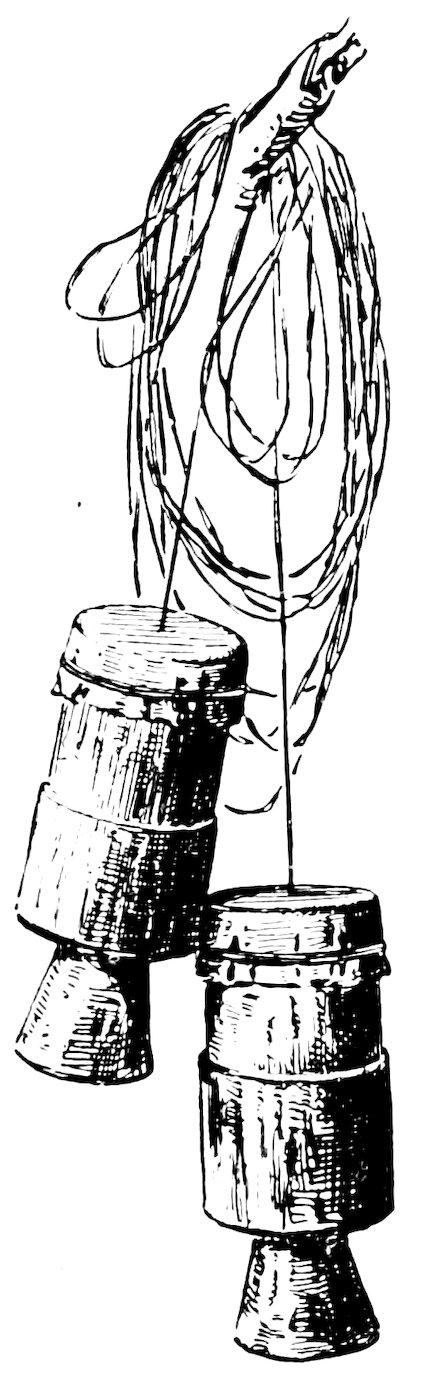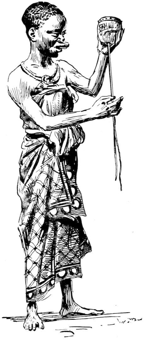 69. We cannot help thinking that Dr. Weule must be mistaken in supposing this game to be borrowed from a European source. The late Commander Cameron, at Kasongo in 1874, saw a slave of the Arab, Juma Merikani, “exhibiting tricks ... with a piece of heavy, hard wood shaped like an hour-glass, and two sticks each a foot in length. Taking a stick in each hand, he could make the wood rotate rapidly and run backwards and forwards ... between the sticks, on a piece of string attached to their ends; then, by a peculiar jerk, he would send the wood flying up into the air, higher than a cricket-ball could be thrown, and catching it on the string, would again set it rolling” (Across Africa, II, 91). At this time, diabolo, of course, was quite unknown in Europe, though it had been a fashionable game in the early part of last century. A writer in the Bulletin de la Société Belge des Etudes Coloniales (December, 1908), in a notice of Dr. Weule’s book, after quoting the above passage from Cameron, refers to a description of the game (under the name of Le Diable), from a work entitled Les Amusements de la Campagne (Paris, 1826). It was believed to have originated in China.—[Tr.]