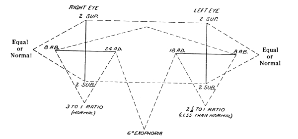 Combinations are describable in similar terms. A tendency of the right eye to turn up and inward, is a “right hyperesophoria”; the left eye to turn down and out, a “left hyperexophoria,” etc. Tendencies of both eyes together are denoted by the terms which follow: