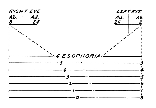 Many cases of esophoria result from overstimulation of the centers for convergence and accommodation, made necessary by hyperopia and astigmatism, entirely disappearing when glasses abolish the need of accommodation. Cases of exophoria are sometimes due to the abnormal relaxation of accommodation and convergence which secures the best distant vision in myopia. Likewise the correction of myopia, by increasing the far point, may diminish the amount of convergence necessary for near vision. [Pg 131]