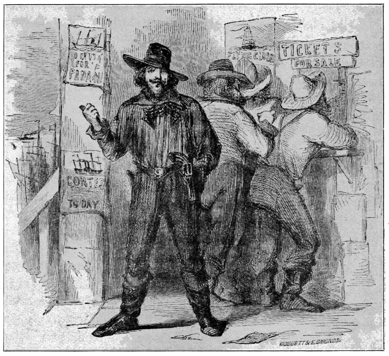 Whichever way they went, upon their arrival in the gold fields the mines proved a wonderful leveler of the classes of men. No distinction of rank was known there. Lawyers, doctors, ministers, men who wore kid gloves and tall hats in the East, were glad to dig in the trenches with the lowliest of laborers, all working for the same reward, the golden talisman of fortune. Unable for any reason, to succeed in the mines, some sought other ways of earning a living, if not a fortune, and so the schoolmaster sawed firewood, the erstwhile judge of an eastern court catered to a hungry crowd, while some business man performed the part of a cook, so wild were the pranks fate played upon these fortune-seekers. But if few came back rich, as wealth is reckoned, all helped to found in power and prestige the glory of the Pacific Slope.