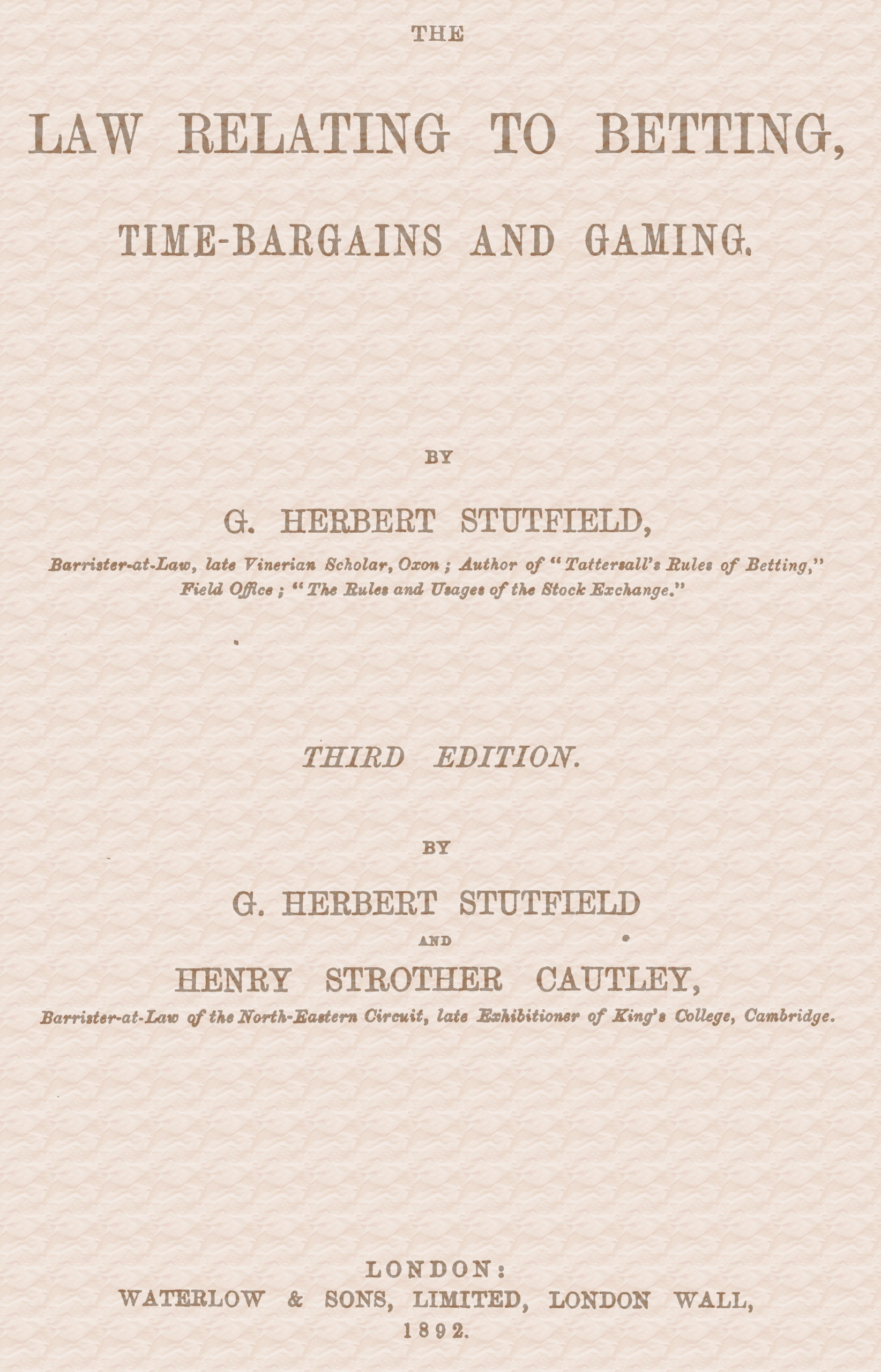 I. What are Contracts by way of Wagering, 32; consensus ad idem necessary, 32; mutuality, 33; One must win, the other must lose, 33; Each party selects an event in which he is to be paid, 33; Substance xrather than the form of Contract must be looked at, 33; Wagers under guise of Sales, void, 35; Agreement with Tipster, 36; Executors must not pay betting debts, 38; Deposit of Stakes on Horse Race, 36; Rescission by Wager, 38; Speculative Sales valid, 39; Principal and Turf Commission Agent, agreements between, not in nature of Wager, 40–; Agent must account to Principal for Winnings, 40–; Authority of Agent to pay Losses, 45; such authority irrevocable, 47–; What Agent must prove, 52; Gaming Amendment Act, 53; Agent cannot recover from third party, 53.