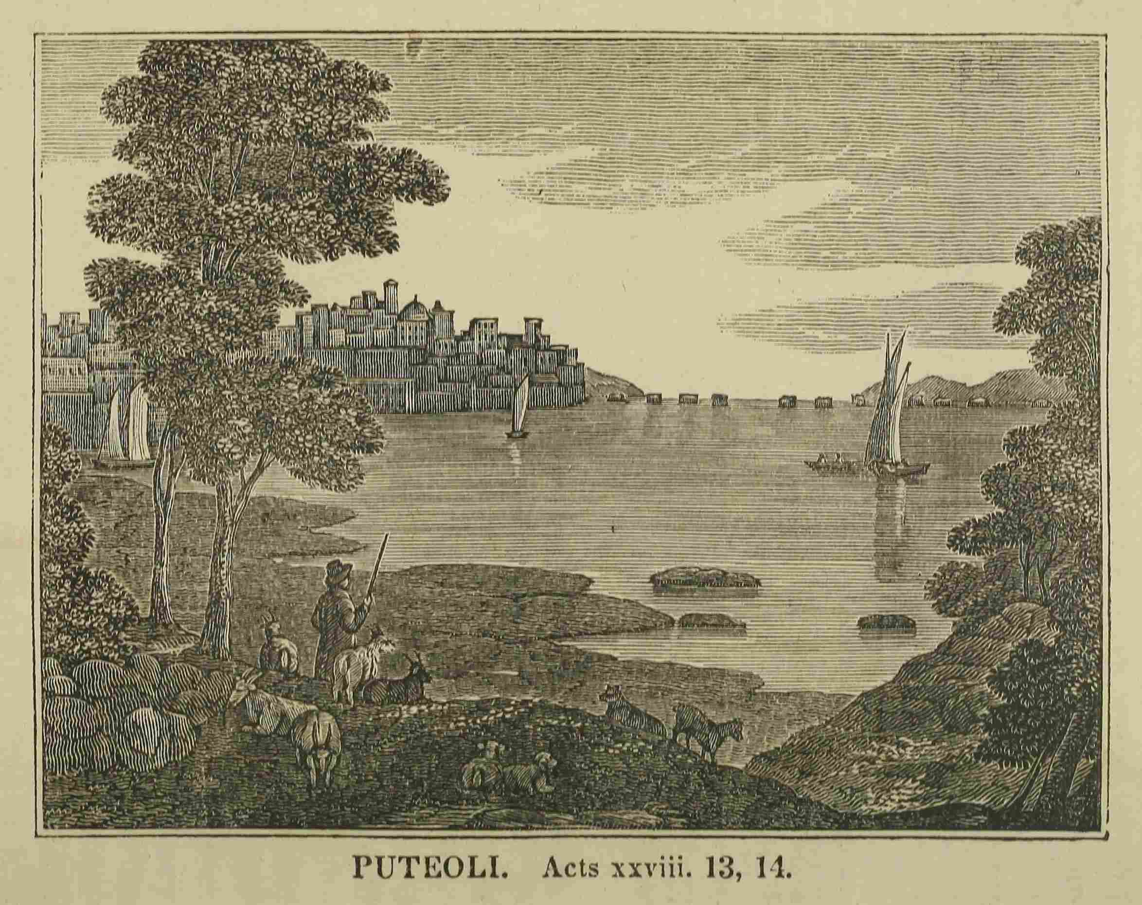 Sailing, on the return of spring, in another Alexandrine vessel, of the same very common name borne by that in which they were shipwrecked, they came next to Syracuse, on the east side of the island of Sicily, and after a stay of three days, turned through the Sicilian strait to Rhegium, on the main-land directly opposite the island. There Paul first saw the soil of Italy, but did not leave the vessel for his land journey, till they came, with a fresh south wind, to Puteoli, a port in the bay of Naples. Here they found Christians, who invited them to rest among them for a week; after which they journeyed along the coast, on the noble road of Pozzuoli and Baiae, for about a hundred miles, to Appius’s Forum, a village about eighteen miles from Rome. At this place, they were met by a number of brethren from the church of Rome; and having journeyed along the Appian way, to the Three Taverns,――a little stopping place a few miles from the city,――they were received by still another deputation of Roman Christians, come out to greet the great apostle, whose name had long been known among them, and whose counsels and revelations they had already enjoyed by his writings. This noble testimony of the esteem in which they held him, was a most joyful assurance to Paul, that, even on this foreign shore, a stranger and a prisoner, he had many near and dear friends; and his noble spirit, before probably depressed and melancholy, in the dark prospect of his approach to the awful seat of that remorseless imperial power that was to decide his doom, now rose to feelings of exultation and gratitude. Entering the vast imperial city, the prisoners were remanded by the centurion to the custody of Burrhus, the noble and influential praefect of the praetorian guard, who was, ex-officio, the keeper of all prisoners of state, brought from the provinces to Rome. Burrhus however, was as kind and accommodating to Paul as Julius had been, and allowed him to live by himself in a private house, with only a soldier as an attendant guard.