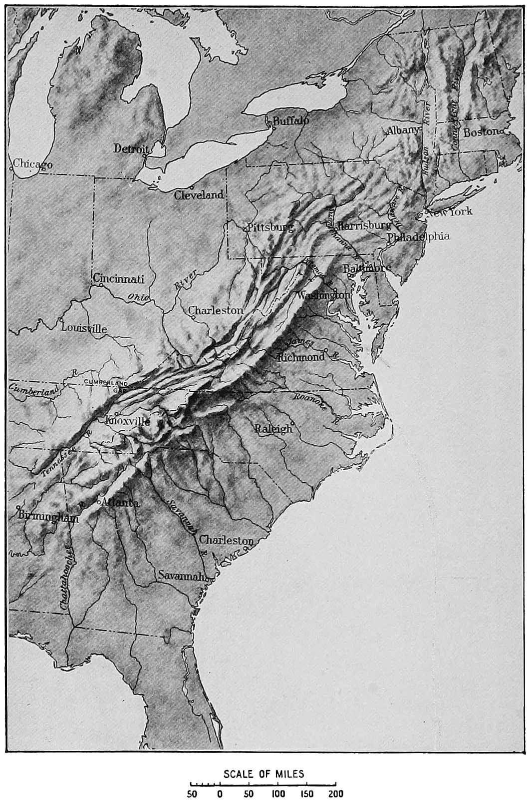 Atlanta is not only at the southern end of the mountains, but it is on the divide which separates the streams of the gulf from those of the Atlantic. On the one hand, not far away, is the Ocmulgee, flowing to the ocean, while westward, and distant but a few miles, the Chattahoochee flows toward the gulf. The latter river has been harnessed by man, and eleven thousand horse power measures the amount of energy that can be carried over the wires to Atlanta to move its cars and turn the wheels of its factories.180 The mills not only spin the cotton of the gulf plains but also turn out fertilizers, work up the timber of the region, and make a multitude of other things to swell the city’s trade with her neighbors.
