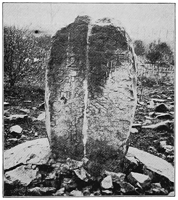 But if we climb through the gap as Boone did, or ride a horse to the Pinnacle, we may look out upon the wonderful valley below, stretching off to the foot of the Great154 Smoky mountains, whose rugged tops carry our eyes far over into North Carolina. Or we may turn the other way and follow Boone’s trail to the Blue Grass. Down in the gap is a rough, weather-beaten pillar of limestone about three feet high and leaning as the picture shows (Fig. 59). It is almost, but not quite, where three states come together, for it is here, at the Cumberland Gap, that the corners of Virginia and Kentucky meet on the edge of Tennessee.